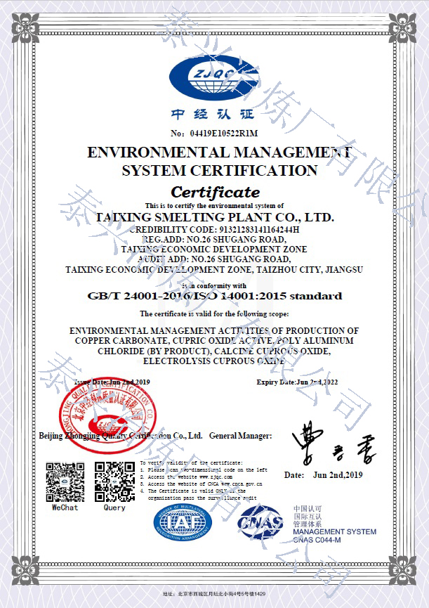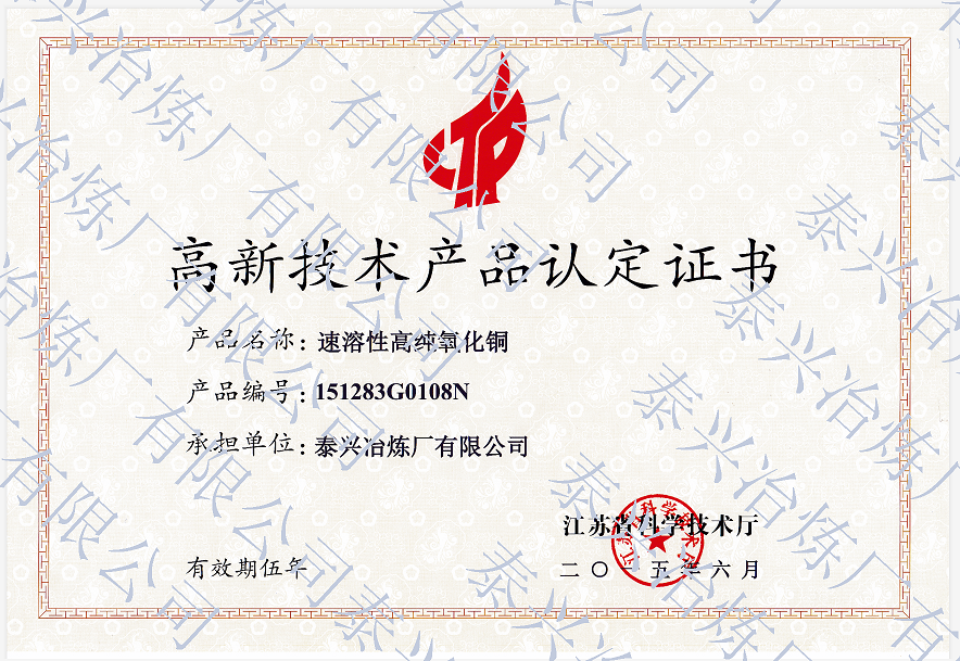 泰興冶煉廠有限公司(原泰興冶煉廠),始建于20世紀(jì)70年代初,現(xiàn)位于江蘇省泰興經(jīng)濟(jì)開(kāi)發(fā)區(qū)。歷經(jīng)40年的創(chuàng)新驅(qū)動(dòng)、穩(wěn)健發(fā)展,已成長(zhǎng)為一家專業(yè)生產(chǎn)堿式碳酸銅、高純電鍍氧化銅、氧化亞銅、氧化銅、無(wú)水硫酸銅、海綿銅粉及副產(chǎn)品聚氯化鋁(凈水劑)等系列無(wú)機(jī)鹽產(chǎn)品及處置不含氨的氯化銅蝕刻液(HW22)15000噸/年的“國(guó)家高新技術(shù)企業(yè)”和地方性骨干企業(yè)。公司總占地面積3.7萬(wàn)平方米,建筑面積4萬(wàn)平方米,注冊(cè)資本2088萬(wàn)元,固定資產(chǎn)1.2億元,年產(chǎn)值約7億元。